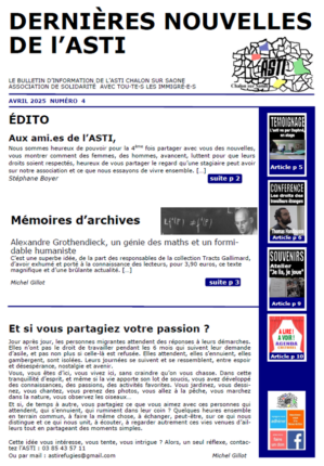 Le quatrième numéro des Dernières nouvelles de l’ASTI est sorti, cliquez sur l’image pour le découvrir ! Vous pouvez vous inscrire ci-dessous pour recevoir les prochaines :